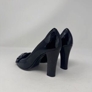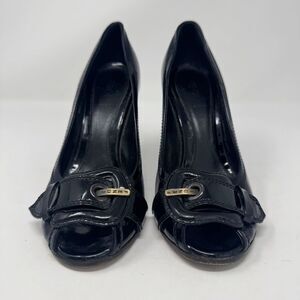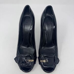 Elevate your style with Fendi's black patent leather heels, featuring a chic gold-toned buckle across the toe. These elegant shoes boast a moderate heel height and a rounded peep-toe design, perfect for both formal and business occasions. Crafted with attention to detail, they offer a sophisticated silhouette that complements any wardrobe. Some normal wear as shown (on the bottom and a scuff as pictured, slight tarnish on the gold buckle) but still good condition!! Women’s size 37.5 (fits like a US 7-7.5).