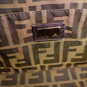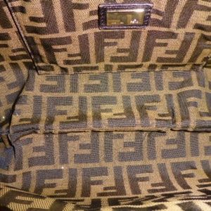 Brown satin canvas mini Fendi bag with gold-tone hardware, brown leather trim, dual braided top handle, brown Fendi logo canvas lining, single pocket at interior wall and zip closure at top. Leather handles with 6 ½” drop