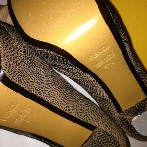 Ferociously feminine, this Fendi tufted textured suede pump helps incorporate a pop of print into a work-ready or after-hours ensemble. Printed flocked suede upper. Asymmetric bow detail atop peep-toe. 1 1/2" double-stacked platform. Finished with leather lining. Made in Italy. Color: Brown/Black.