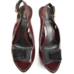 Burgundy, pebbled leather peep toe, platform Heels/Pumps with black, grosgrain bow accented by engraved "FF" logos around platform and gold, metal "FF" logo buckle