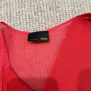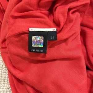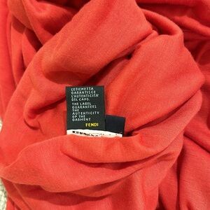 Gorgeous draping & coral color. I removed the fabric tag as it was so large, but this dress is cotton jersey with 3% Elasthane and the lining is the same fabric. The mesh sleeve and side panel will be nylon or polyester. Purchased in Florence, Italy and worn, maybe, 3 times. Dry clean only. Size 44 fits a 6 best, as it runs small.