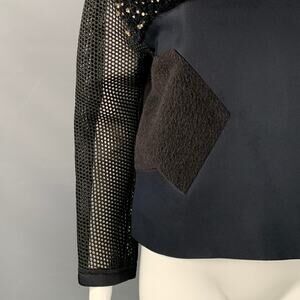 FENDI Fall 2014 casual top in a navy and green polyamide blend fabric featuring a patchwork design with rhinestones, one mesh sleeve (with mesh details on other sleeve), and back zipper closure. Made in Italy.