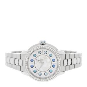 This is an authentic FENDI Stainless Steel Diamond Bezel Mother of Pearl Topaz 34mm 12100S Crazy Carats Quartz Watch. The watch is crafted of stainless steel and features a mother of pearl dial with topaz accents, diamond bezel weighing approximately .71 total carat weight, sapphire crystal, and a quartz movement.