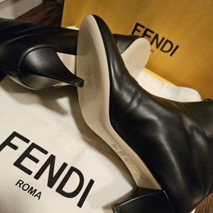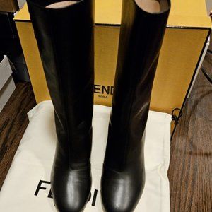 Luxurious Italian leather boots flaunting embossed FF Calligraphy motif at side.
