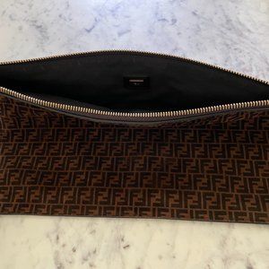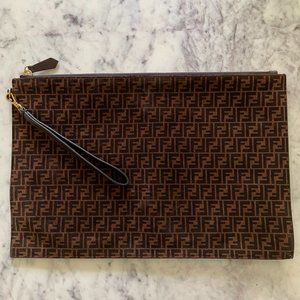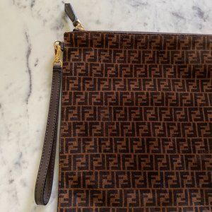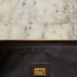 Large pouch with removable bracelet handle in very good condition, minor wear. Zipper closure. Made of beige leather with micro FF print in shades of brown. Gold-finish metalware.