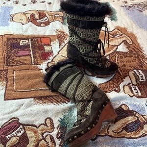 FENDI Logo Wood Platform Fur Lined Brown Winter Boots 37 studded Rare