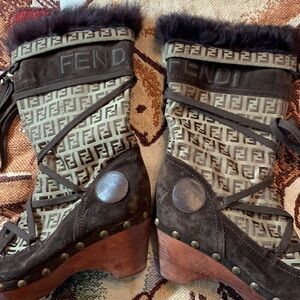 FENDI Logo Wood Platform Fur Lined Brown Winter Boots 37 studded Rare