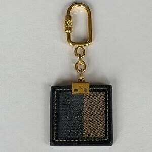 Fendi square leather keychain featuring signature Fendi circular logo emblem and gold-tone hardware. Sturdy chain and carabiner-style clip, perfect for attaching to bags, keys, or belt loops. Stylish two-tone brown and black leather with detailed stitching. Great luxury accessory to elevate any everyday item. Gently pre-owned and in excellent condition.