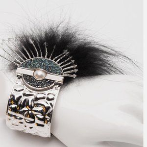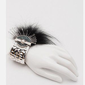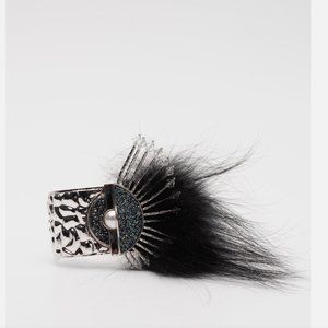 FENDI Metal Hinged Cuff Bracelet Size L Monster Eye Silver Fox Fur Trim swarovsk