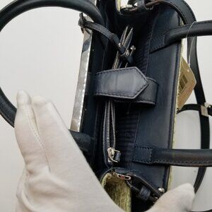 The FENDI PETITE Toujours Hand shoulder crossbody bag is a stylish and versatile purse. Made with a combination of leather and straw, this medium-sized rectangular bag features a snap closure, black leather double handles, and silver hardware. Perfect for all occasions such as casual outings, workwear, dinner parties, or business meetings, this crossbody bag also includes inner pockets for organization. With its designer theme and luxurious details, the Fendi bag is a fashionable choice for the modern woman. Made in Italy, this bag exudes quality and sophistication.