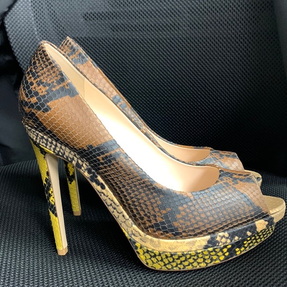 Amazing peep toe pumps in python skin - brown and tan with yellow heel.