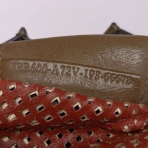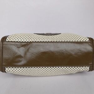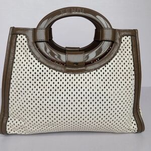 FENDI Runaway Shopper Tote in brown and white calfskin featuring a round handle, a detachable shoulder strap, a woven leather effect, a perforated style, gold-tone hardware, an open top design, a debossed logo and a branded leather patch to the front. Will throw in a supple strap for handsfree convenience.