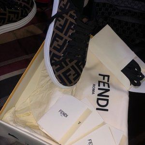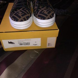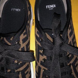 DARK BADGE AND BLACK FENDI SHOES, CLOTH MATERIAL VERY GOOD CONDITION, NO ODER STILL LOOK GREAT. COMES WITH BOX, DUST BAGS,