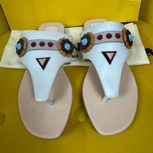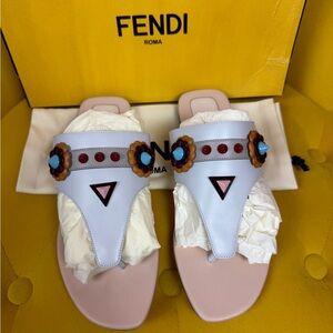 Elegant Fendi sandals with floral embellishments. White and pink design. Perfect for stylish outings brand new with tags.