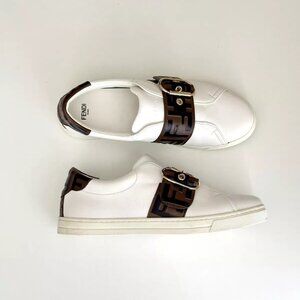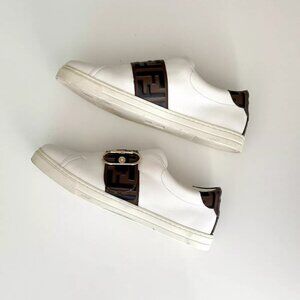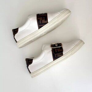 Details: white leather, low top style, debossed logo on tongue, wide adjustable leather strap with brown/black embossed FF logo & goldtone buckle, inner side stretch gore, back heel w/leather brown/black embossed FF logo, logo on back sole, rubber soles w/designer logo. Minor marks along soles. Overall gorgeous!!!