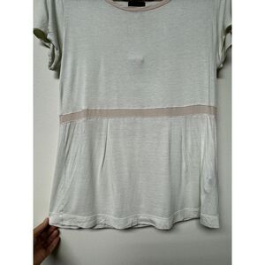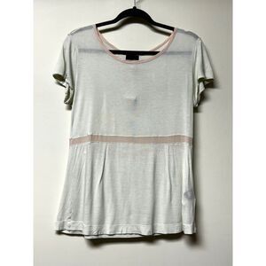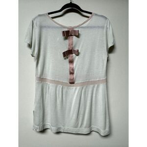 Adorable, feminine, coquette style ivory with blush pink ribbon detail short sleeve tee. Rayon, polyester and silk. Bow detail along the back. Dry clean only! Italian size 44, US L-XL.