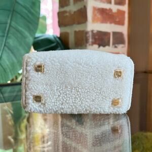 A cozy yet chic statement piece, this mini tote bag combines plush white and taupe shearling with smooth Vitello King leather, accented by Fendi's iconic plexiglass logo for a modern touch. Its compact design and luxurious textures make it a perfect blend of warmth and high-fashion sophistication, ideal for elevating your cold-weather style. B+ Very Good Condition