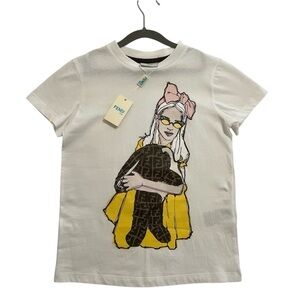 Stylish FENDI tee with a unique graphic design. Features a girl with a bow and Fendi logo details. Fits an XS adult