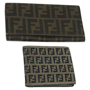 FENDI Zucca Canvas Zucchino Canvas Wallet 2Set Black Brown Navy Auth