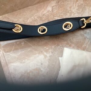 FENDI black leather camera bag in excellent condition. Strap is adjustable with gold tone “F” design cutouts. Bag measures approximately 9” wide by 6”high and 3” deep. Inside is stain free and has a single pocket. Dust bag included. May be used as a shoulder bag or crossbody. Strap is detachable.