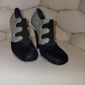 Styling Fendi ankle booties with navy shearling cap toe, embossed print. From the runway. Gently used. No marks or scuffs.
