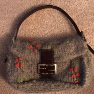 FENDI Baguette in EXCELLENT condition. AUTHENTIC. This bag is from the Zucca collection. The bag features an embellishment of embroidered leaves & cherries & a looping leather shoulder strap. The frontal flap opens with a magnet to a fabric interior.This bag has no visible use on the exterior. The interior has few stains around the zipper area, however, not taking anything away from this awesome bag. L=11 in W=3in H= 6in.