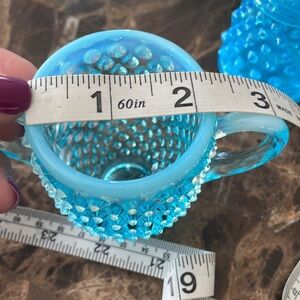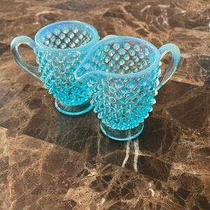 Beautiful set FENTON Vintage Blue Opalescent Hobnail Creamer,Sugar Bowl,2/Cruet with stopper and Ruffled Bonbon mini dish,in beautiful vintage condition,no chips or damage,accept offers.
