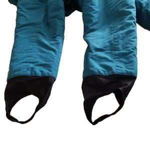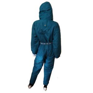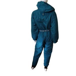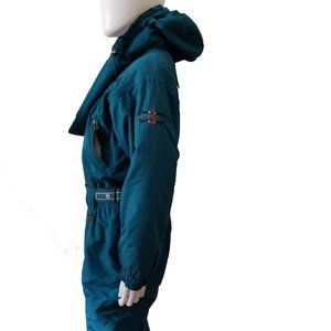 This is a very cool, vintage 90's Fera Ski Suit. The snowsuit is in an excellent condition and would be great for a ski weekend. It is Teal color with an adjustable belt. It has a decorative ribbon that matches the belt. It has a front zipper and 2 side pockets with zipper closure. Has elastic to tuck boots. Very warm and comfortable. Worn 2 times. Cross snap closure in bust area. The size is Teen 18 which is extra large in the Fera chart. The mannequin is a size 4, 5'8 tall and snowsuit is big on her.