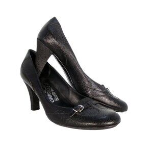 Classic mid-high heel pumps from Salvatore Ferragamo, in black pigskin leather, these have a round toe accented with wingtip and buckle detail. Textured rubber heel adds a twist to this classic style. Glossy croc-embossed leather sole has a textured rubber pad for traction. Leather lining and footebd. Made in Italy.
