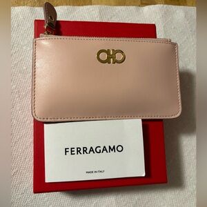 Ferragamo pale pink card holder. Gold hardware. Zip closure. 6 card slots! Soft and beautiful leather. Made in Italy! 100% authentic purchased from Saks! I used it a few times only it’s in excellent condition with box and tag! 6"W x 3.25"H