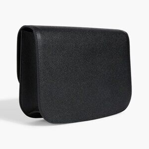 The $1390 Ferragamo Gemini Pebbled-Leather Shoulder Bag in Black is a stylish and elegant crossbody bag perfect for casual occasions. Made from high-quality leather with a pebbled finish, this small-sized bag features a clasp closure, black hardware, and a black leather shoulder strap for comfortable wear. The bag also comes with its original dust bag and is part of the Ferragamo product line known for its fashion-forward designs. Made in Italy, this Ferragamo bag combines luxury and functionality in a timeless and classic style.