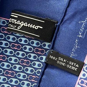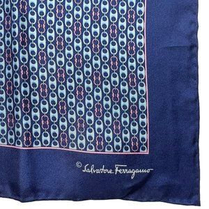 Navy Blue/Beige, 100% Silk pocket/bag scarf accented by "Salvatore Ferragamo" logo in bottom corner