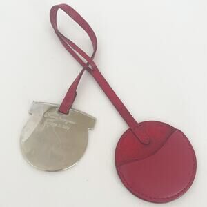 Salvatore Ferragamo red leather and silver-tone bag charm. Preowned. Minor rubbing on the silver plate. Red leather has some rubbing. Leather has been repaired. Perfectly functional. Silver piece comes out if you want, but stays inside the sleeve.