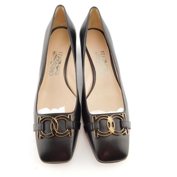 FERRAGAMO Signature Logo Horse Bit Buckle Dark Brown Leather Block Heel Pump 9.5