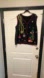 This is a handmade ugly Christmas vest. It does not have a size. However, my best guess is the larger extra large women’s on the front and features a velvet Christmas tree that’s decorated with presents underneath felt and some Christmas balls on the other side five button front sleeveless V-neck.