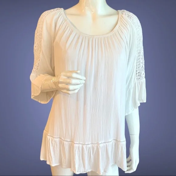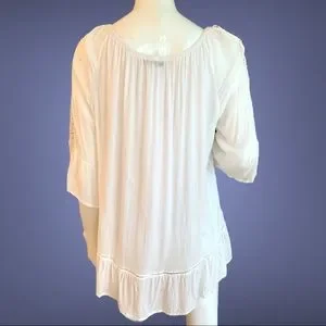 Elastic scoop neck. Wear off or on shoulders. Ruffle on ends of 3/4 sleeves & bottom of top. Size Medium Petite. Pre-owned. In good condition.