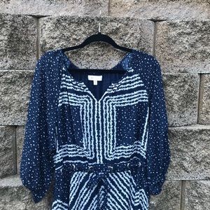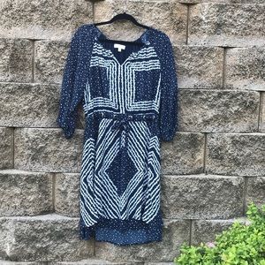 EUC! Navy and white designed dress with drawstring across waist- it threads through round opening. Scrunched sleeve ends. Very cute and can be treated casually or worn “up”💕💕 ask questions and make offers👍🏼