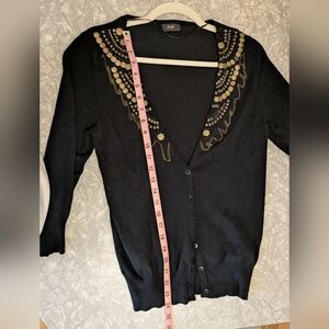 Chic black cardigan by F&F. Features stunning metallic embellishments. Perfect for a stylish look.