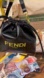 FF black leather bag featuring a bold yellow logo. Stylish and elegant design.