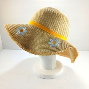 F&F brand floppy hat with daisy accents. Made of straw or a similar material, floppy brim and is decorated with white daisy appliques.