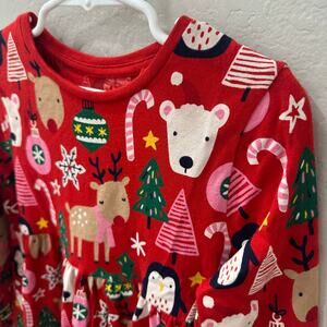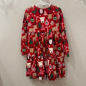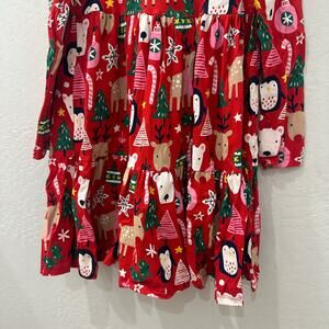 F&F long sleeve dress size 6-7. Bright red background with fun Christmas winter print all over - reindeer, Christmas trees, polar bears, penguins. Super cute tiered style for fun twirl. Very good condition.