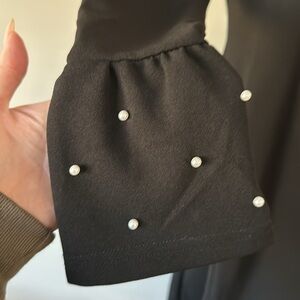Introducing the FHQ Collection Embellished High Slit Long sleeved Black Mini Dress in Size Small. This dress is perfect for any party or cocktail occasion. The dress features a round neck and pullover closure with long slit sleeves and pearl like beaded accents that add a touch of elegance to the dress.