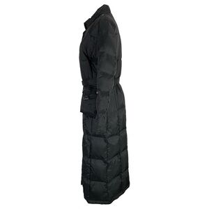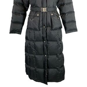 Features: 100% down filled. High collar. Long length. Long sleeves. Puffer style. Pockets. Zip and snap closure. Belted waist line.