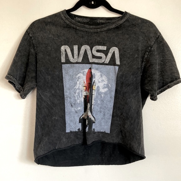 Fifth sun nasa high low top super cute black washed look. Very good condition size small. Top of neck to bottom of front of shirt is higher is approx 15.5 in long, back is approx 20 in long. Arm pit to arm pit is approx 16 in.