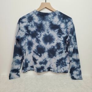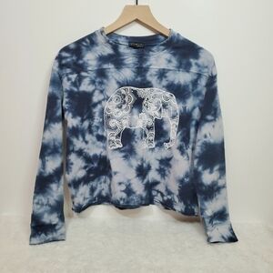 Fifth Sun Boho Elephant Tie Dye Crop Shirt. Size Large, approximately measures 21" pit to pit, 21" from top shoulder to hem, tie dye navy blue & white, long sleeves, raw bottom hem, crew neck with a white graphic elephant print, soft 60% cotton/40% polyester. Excellent condition.