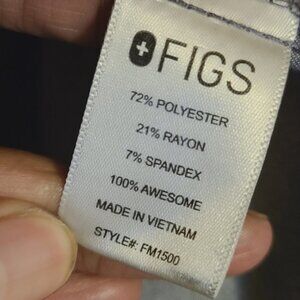 Men's gray, v-neck, short sleeve, one double pocket Leon scrubs top by Figs Technical Collection, size XS. Small splits on the sides; polyester, rayon and spandex fabric blend. Logo on sleeve. Excellent pre-owned condition; no flaws.