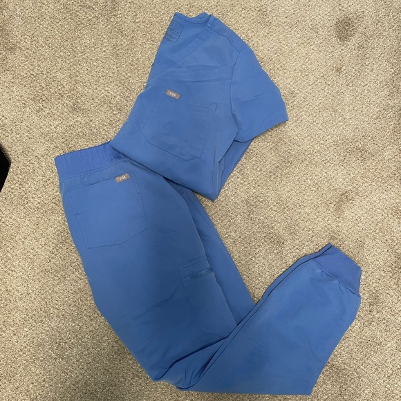 Blue FIGS Zamora jogger and classic pocket scrub top.