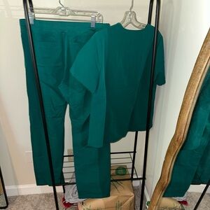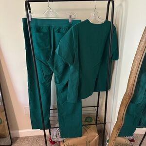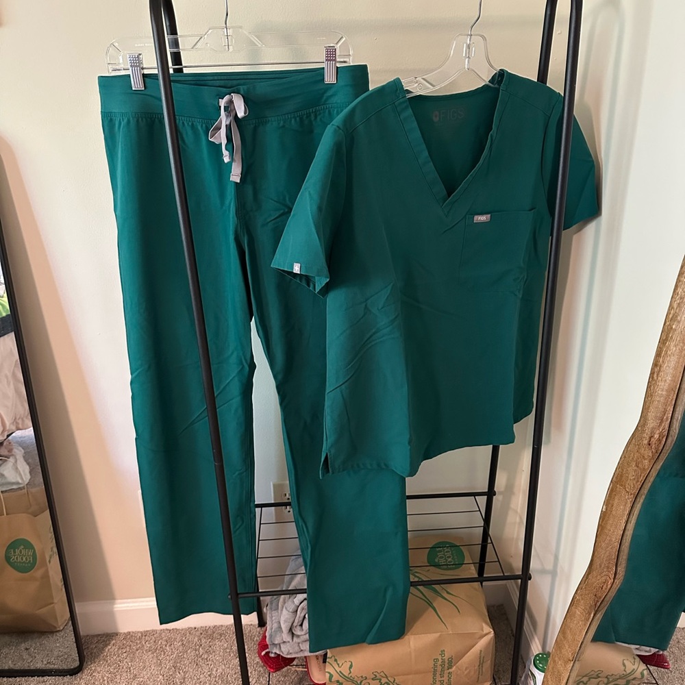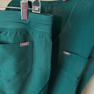 Comfortable FIGS scrub set featuring a Catarina v-neck top and Livingston basic pants. Ideal for healthcare professionals. Not quite sure how to describe this color, but the first picture is in standard lighting, and I have also included a picture with the flash (2nd pic) as well as in the sun (last pic)! I would say it’s like a deep sea green. PANTS ARE MEDIUM TALL FIT!!!