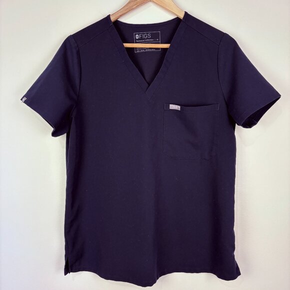 The FIGS Women Navy Catarina V-Neck One-Pocket Technical Scrub Top in Medium size is a solid blue top made of polyester material, designed specifically for women in the medical industry. The top features a V-neck design and one pocket for convenience. It is machine washable for easy care and is part of the FIGS brand, known for its high-quality and stylish uniforms. Made in Vietnam, this basic top is a practical and versatile choice for healthcare professionals.