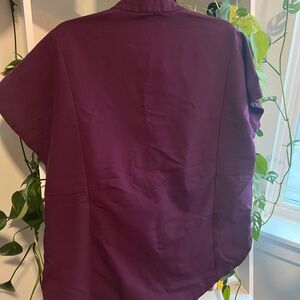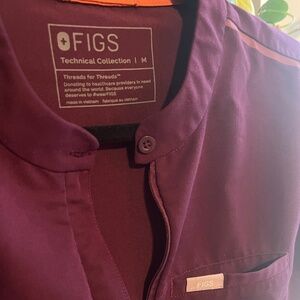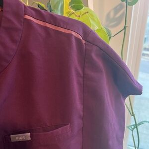 Women's FIGS medium scrub top. Somewhere in between magenta and maroon color. Oversized fit. Quarter zip and button on collar. Two pockets on front of shirt. Limited edition style top and color.